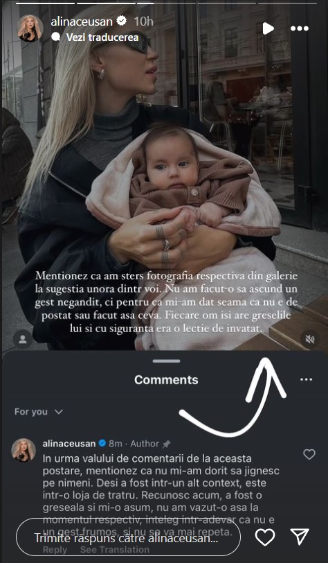 „Mentionez ca am sters fotografia respectiva din galerie la sugestia unora dintre voi. Nu am facut-o sa ascund un gest negandit, ci pentru ca mi-am dat seama ca nu e de postat sau de facut asa ceva. Fiecare om isi are greselile lui si cu siguranta era o lectie de invatat”, a afirmat influencer-ul într-un story pe Instagram.
