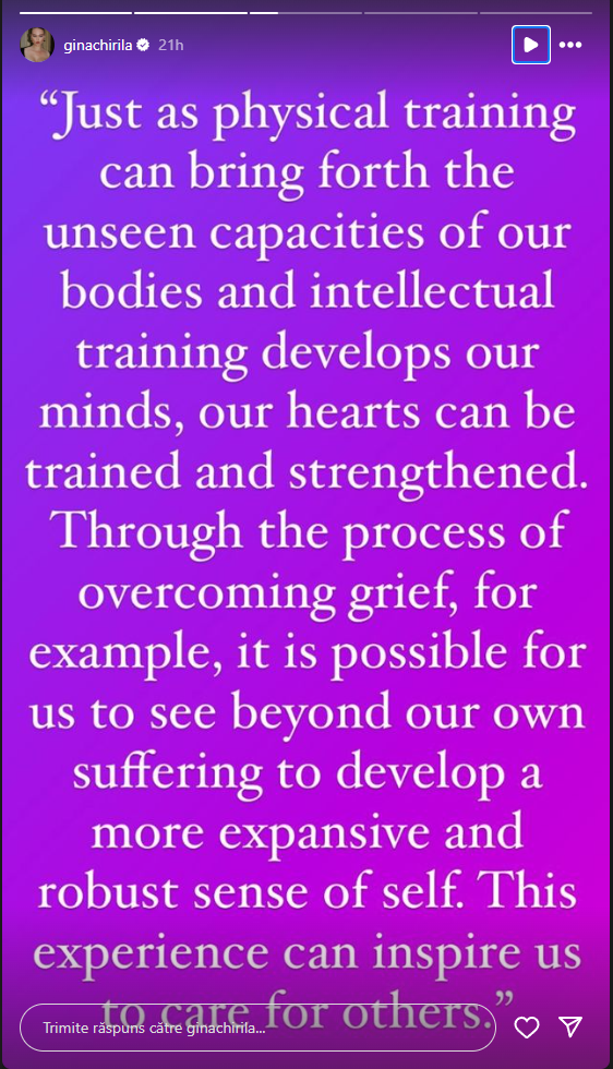 „La fel cum antrenamentul fizic poate scoate la iveală resurse nebănuite ale corpului nostru, iar antrenamentul intelectual dezvoltă mintea, și inimile noastre pot fi «antrenate» și să devină mai puternice. Prin procesul de depășire a durerii, de exemplu, este posibil să vedem dincolo de propria suferință pentru a dezvolta un sine mai puternic. Această experiență ne poate inspira să avem grijă de alții”, este mesajul publicat de Gina Chirilă, pe pagina ei de Instagram, la InstaStory.