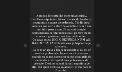 „De câteva săptămâni trăiesc o stare de frustrare, neputință și spaimă de nedescris. Cei din jurul meu mă văd într-o stare de anxietate cum n-am mai trăit până acum. Pentru că sunt complet neputincioasă în fața unei situații pe care nu am cum să o gestionez mai bine decât o fac.