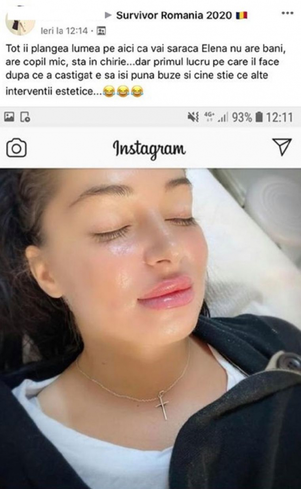 „Tot îi plângea lumea pe aici, vai, săraca Elena nu are bani, are copil mic, stă în chirie…dar primul lucru pe care îl face după ce a câștigat este să își pună buze și cine știe ce alte intervenții estetice…” a scris un internaut.
