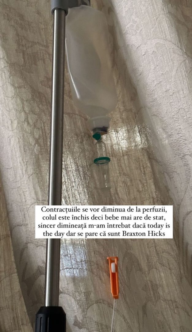 „Contracțiile se vor diminua de la perfuzii, colul este închis, deci bebe mai are de stat. Sincer, dimineață m-am întrebat dacă today is the day (dacă astăzi este ziua în care o să nască, n.r.), dar se pare că sunt Braxton Hicks (dureri de travaliu false, care pot fi resimțite în al doilea sau al treilea trimestru de sarcină)”, a mai scris vedeta pe Instagram.