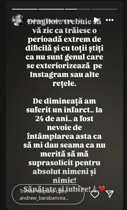 „Dragilor, trebuie să vă zic că trăiesc o perioadă extrem de dificilă și cu toții știți că nu sunt genul care se exteriorizează pe Instagram sau alte rețele… De dimineață am suferit un infarct… la 24 de ani. A fost nevoie de întâmplarea asta ca să îmi dau seama că nu merită să mă suprasolicit pentru absolut nimeni și nimic. Sănătate și iubire”, a scris Andrew, într-un mesaj postat pe InstaStory.
