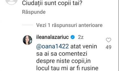 „Atât venin să ai să comentezi despre niște copii, în locul tău mi-ar fi rușine să mă uit în oglindă”, a fost reacția promptă a Ilenei Lazariuc.