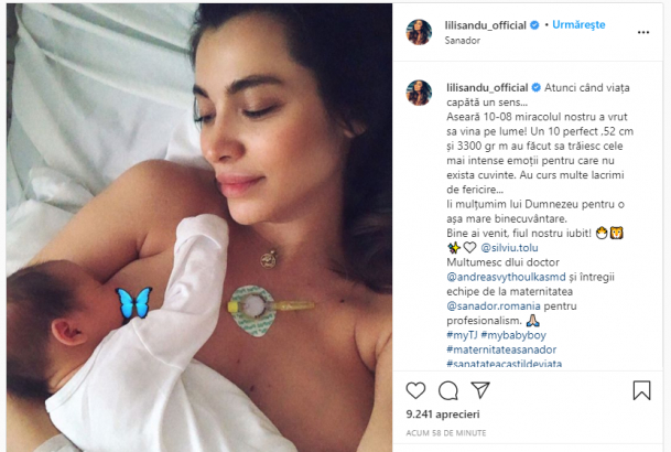 „Atunci când viața capătă un sens…Aseară 10-08 miracolul nostru a vrut sa vina pe lume! Un 10 perfect ,52 cm și 3300 gr m au făcut sa trăiesc cele mai intense emoții pentru care nu exista cuvinte. Au curs multe lacrimi de fericire…Ii mulțumim lui Dumnezeu pentru o așa mare binecuvântare.Bine ai venit, fiul nostru iubit!”, a scris vedeta pe Instagram.