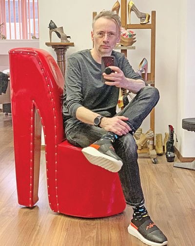 „Acest scaun, în formă de pantof, mi l-a dăruit una dintre cliente, care a fost foarte mulțumită de modelele lucrate. Îmi colorează atelierul, este roșu ca focul. Este lucrat din lemn și îmbrăcat în vinilin, toți îl admiră”, a spus acesta pentru Click.
