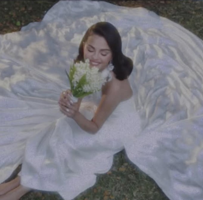 Pentru cel mai important moment din viața ei, Selena Gomez a purtat o rochie albă spectaculoasă, fără spate, cu volane la decolteu și detalii drapate. Ținuta a fost accesorizată cu cercei din platină și diamante semnați Tiffany & Co. Look-ul a fost completat de coafura bob și manichiura albă, detalii care au subliniat eleganța simplă a artistei.
