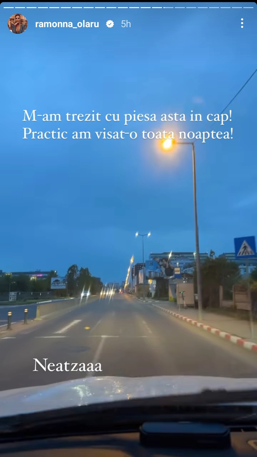 În urmă cu puțin timp, în drumul spre emisiune, Ramona Olaru a împărtățit cu fanii de pe rețelele de socializare piesa cu care s-a trezit în gând în această dimineață. Asistenta de la Neatza a spus că a visat întreaga noapte melodia. Este vorba despre piesa Razna a Emmei.