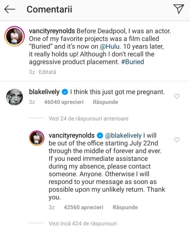 Ryan Reynolds și Blake Lively formează unul dintre cele mai îndrăgite cupluri, iar cei doi sunt cunoscuți pentru tachinările amuzante dintre ei. De data aceasta, actrița i-a spus în glumă lui Ryan Reynolds că are impresia că este însărcinată, avand în vedere că aceștia au deja trei copii. Actorul nu s-a putut abține și i-a răspuns soției sale, iar fanii s-au amuzat extrem de tare datorită replicii pline de umor a actorului.