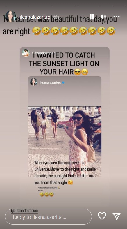 „Apusul a fost frumos în acea zi, ai dreptate”, a scris frumoasa moldoveancă, într-un mesaj însoțit de o mulțime de emoticoane de râs.