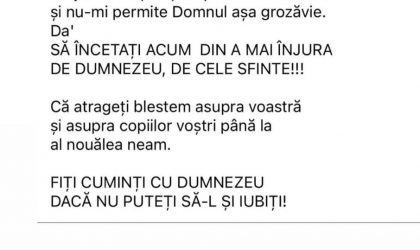 Nu judec eu pe aproapele meu că-s om și nu-mi permite Domnul așa grozăvie. Dar să încetați acum din a mai înjura de Dumnezeu, de Cele Sfinte!!! Că atrageți blestem asupra voastră și asupra copiilor voștri până la al nouălea neam. Fiți cuminți cu Dumnezeu dacă nu puteți să-L și iubiți!”, a scris ea într-un InstaStory.