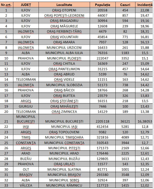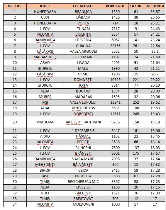 În ceea ce privește localitățile, 319 au trecut de 10 la mia de locuitori. Cea mai mare arată de incidență se regăesște în comuna Brănișca, din județul Hunedoara: 39, 87 la mia de locuitori.