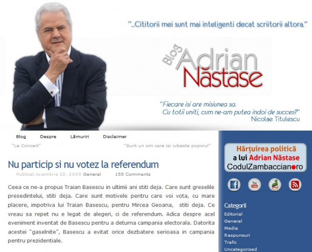 Este vorba de fostul premier și fostul lider PSD Adrian Năstase, aflat astăzi în pușcărie pentru fapte de corupție. În 2009, Năstase îndemna lumea pe blogul personal să boicoteze referendumul privind reducerea numărului de parlamentari.