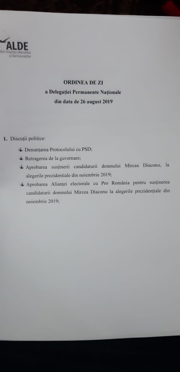 ALDE discută, luni, despre denunțarea protocolului cu PSD și retragerea de la guvernare, arată ordinea de zi a Delegației Permanente Naționale din 26 august.