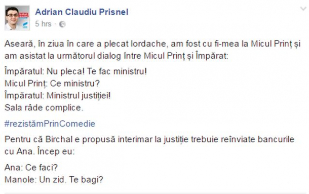 "Aseară, în ziua în care a plecat Iordache, am fost cu fi-mea la Micul Prinț și am asistat la următorul dialog între Micul Prinț și Împărat:
