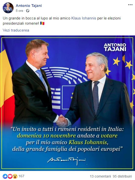 Acesta a publicat o imagine în care apare dând mâna cu președintele României și a atașat mesajul adresat românilor din Italia: „O invitaţie către toţi românii rezidenţi în Italia: duminică, 10 noiembrie, mergeţi să-l votaţi pe prietenul meu Klaus Iohannis din marea famile a popularilor europeni”.