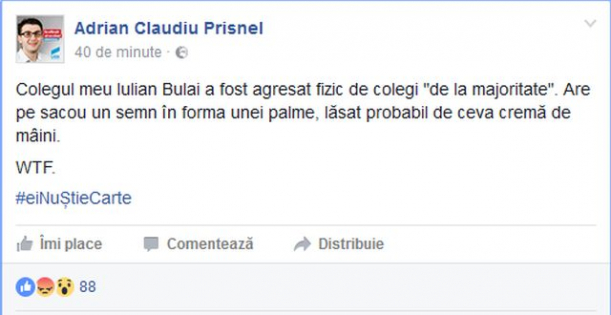 "Colegul meu Iulian Bulai a fost agresat fizic de colegi "de la majoritate". Are pe sacou un semn în forma unei palme, lăsat probabil de ceva cremă de mâini.