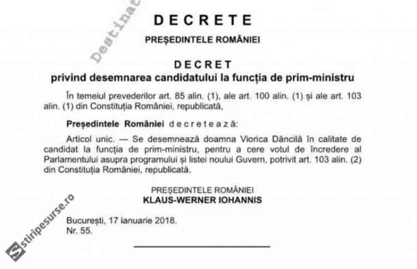 Klaus Iohannis a greșit decretul prin care a desemnat-o pe social-democrata Viorica Vasilica Dăncilă prim-ministru al României.