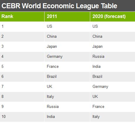 Pentru următorii 10 ani, estimările CERB indică o altă surpriză: locul Germaniei va fi luat de Rusia iar cel al Franței, de India. Marea Britanie va surclasa actuala rivala Franța, care va coborî de pe locul 5 până pe 9.