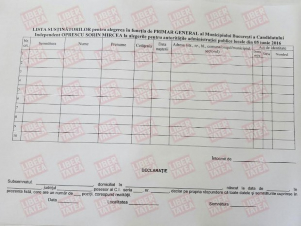 Potrivit portalului online mai sus menționat, listele de susținători cu numele lui Oprescu au fost deja tipărite și împărțite, cu scopul de a fo completate cu numele celor care vor semna pentru a-i susține candidatura în cursa pentru Primăria București.