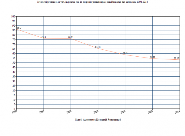 Istoricul prezenţei la vot, în primul tur, la alegerile prezidenţiale din România din intervalul 1990-2014, potrivit istoricului oferitde Autoritatea Electorală Permanentă