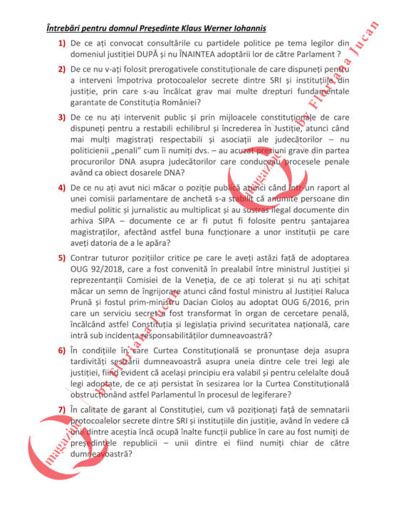 2)De ce nu v-ați folosit prerogativele constituționale de care dispuneți pentru a interveni împotriva protocoalelor secrete dintre SRI și instituțiile din justiție, prin care s-au încălcat grav mai multe drepturi fundamentale garantate de Constituția României?