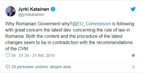 ”De ce, Guvernule român, de ce? Comisia Europeană urmărește cu mare îngrijorare ultimele evoluții privind statul de drept din România. Atât conținutul, cât și procedura de adoptare a ultimelor modificări par a fi în contradicție cu recomandările MCV (Mecanismului de Cooperare și Verificare)”, a scris Jyrki Katainen, pe Twitter.