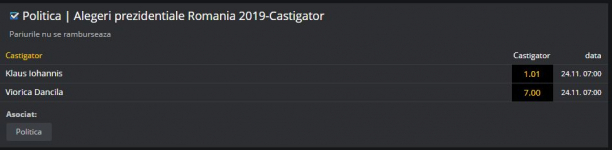 În schimb, o victorie a Vioricăi Dăncilă are cotat 7. Prin urma, cine pariază pe Dăncilă, dacă va avea și câștig de cauză atunci va primi înapoi de 7 ore suma pariată.