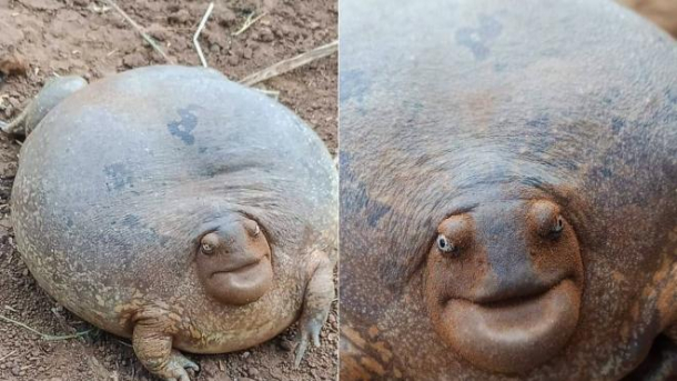 Operatorul excavatorului s-a oprit din lucru și a început să caute animalul printre pietre și vegetație. A descoperit că este vorba despre o broască rotundă, cu un aspect neobișnuit, de dimensiunea unei palme. Capul creaturii era rotund și părea să zâmbească.