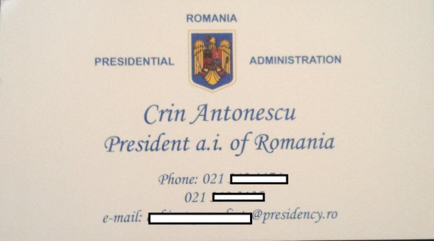Pe acestea sunt afişate două numere de telefon fix şi o adresă de email. Funcţia trecută este cea de Preşedinte interimar al României.