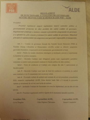 Protocolul stipulează că orice decizie trebuie consemnată într-un proces verbal care trebuie semnat de cei 3 preşedinţi, Dragnea, Tăriceanu şi Daniel Constantin, în caz contrar fiind lovită de nulitate. O schimbare majoră deoarece până acum deciziile erau luate exclusiv de Liviu Dragnea, uneori după consultarea cu Tăriceanu.