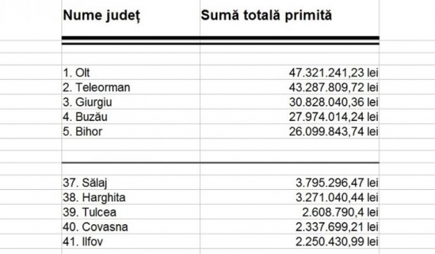 Pe ultimele locuri în topul alocărilor se află, în ordine, Sălaj, Harghita, Tulcea, Covasna și Ilfov, adică cel mai mic județ și județe din zone care în mod tradițional nu sunt fiefuri ale PSD.
