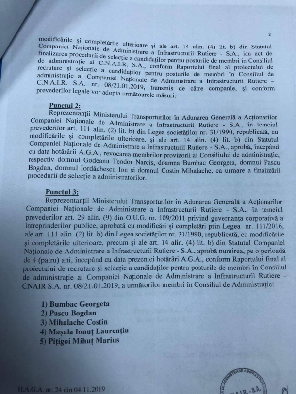 ”Reprezentanții Ministerului Transporturilor în Adunarea Generală a Acționarilor Companiei Naționale de Administrare a Infrastructurii Rutiere – S.A., în temeiul prevederilor art. 29 alin. (9) din OUG nr. 109/2011 privind guvernanța corporativă a întreprinderilor publice, aprobată cu modificări și completări prin Legea nr. 111/2016, ale art. 111 alin. (2) lit. b) din Legea societăților nr.31/1990, republicată, cu modificările și completările ulterioare, precum și ale art. 14 alin (4) lit. b) din Statutul Companiei Naționale de Administrare a Infrastructurii Rutiere – S.A., aprobă numirea, pe o perioadă de 4 (patru) ani, începând cu data prezentei hotărâri A.G:.A.., conform Raportului final al proiectului de recrutare și selecție a candidaților pentru posturile de membri în Consiliul de administrație al Companiei Naționale de Administrare a Infrastructurii Rutiere – CNAIR S.A. nr.08/21.01.2019, a următorilor membri în Consiliul de Administrație: Bumbac Georgeta, Pascu Bogdan, Mihalache Costin, Mașala Ionuț Laurențiu, Pițigoi Mihuț Marius”, se arată în decizia citată.