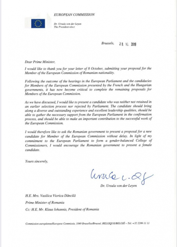Trebuie remarcat că în scrisoarea Ursulei von der Leyen se recomandă României să vină cu o femeie pentru propunerea de comisar european, dar Viorica Dăncilă a neglijat acest lucru și a înaintat nominalizarea lui Victor Negrescu.