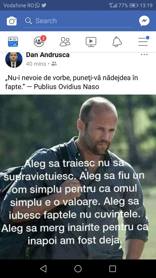 Ministrul Economiei, Dănuț Andrușcă, a postat pe Facebook o imagine cu actorul Jason Statham și două citate pline de substanță. Andrușcă este cel despre care Adrian Țuțuianu, colegul său de partid, a spus că este ”cel mai idiot ministru” și un om ”atât de prost încât nu poate asculta mai mult de 5 minute”.