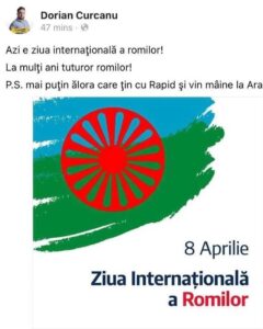 „Azi e ziua internațională a romilor! La mulți ani tuturor romilor! PS. mai puțin ălora care țin cu Rapid și vin mâine la Arad”, a scris consilierul local pe contul personal de Facebook.