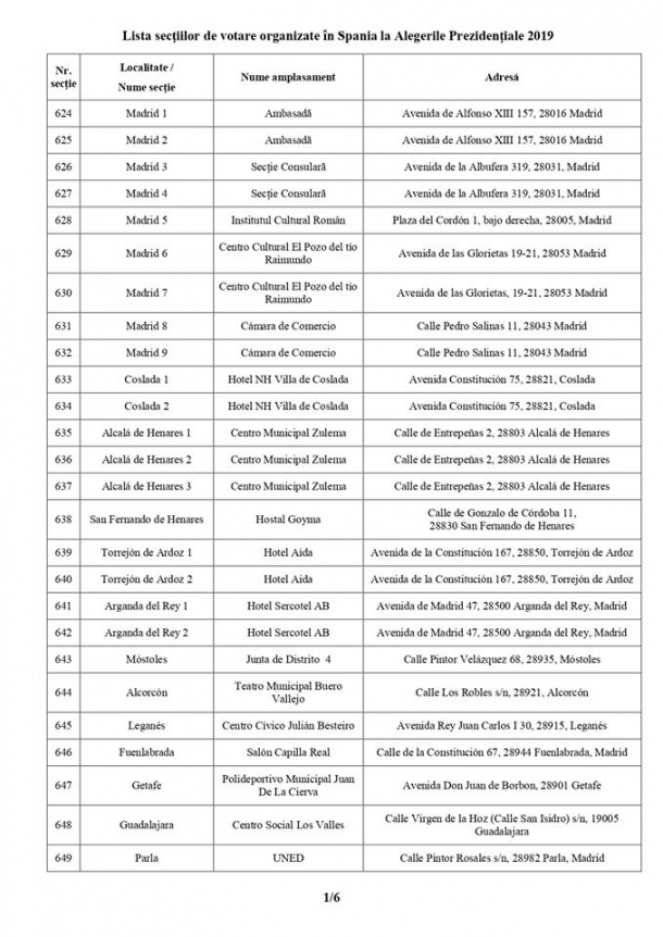 DIASPORA VOT / SPANIA / ALEGERI PREZIDENŢIALE 2019. Ambasada României în Spania a publicat lista finală a celor 143 de secții de votare la care românii vor putea merge pentru a alege viitorul președinte.