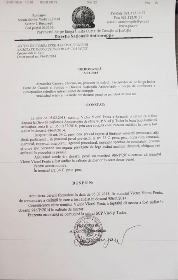 Victor Ponta este doar martor în noul dosar al lui Liviu Dragnea, a răspuns procuroarea DNA Alexandra Carmen Lăncrănjan, după solicitarea lui Ponta de a-i fi spus în ce calitate va fi audiat.