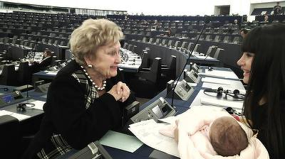 Eurodeputata Elena Băsescu (PDL/PPE) a revenit, după o pauză de două luni în Parlamentul European, ducându-și și fiica, Sofia, la Strasbourg, pentru a prezenta-o colegilor.