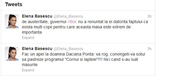 „Fac un apel la doamna Daciana Ponta: vă rog, convingeţi-vă soţul să păstreze programul «Cornul şi laptele»!!! Nici când s-au luat măsurile de austeritate, Guvernul Boc nu a renunţat la el datorită faptului că există mulţi copii pentru care această masă este extrem de importantă„, a scris Elena Băsescu, pe contul său de Twitter.