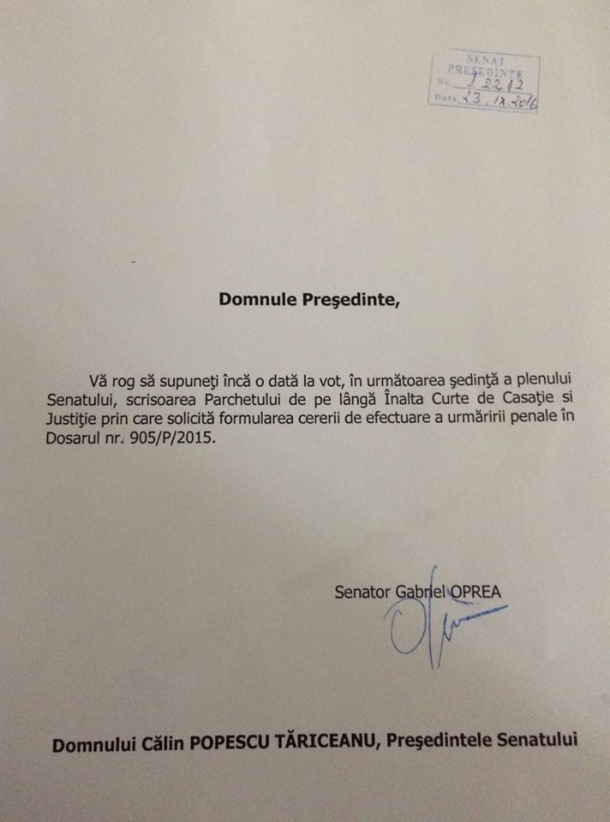 Această solicitare vine în contextul în care joi au avut loc proteste în mai multe localități din țară împotriva deciziei Senatului de a îl proteja pe Gabriel Oprea. În protestul din fața Parlamentului, aproximativ 2000-3000 de persoane au luat parte și au manifestat împotriva votului de împiedicare a începerii urmării penale.