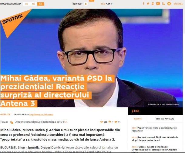 Sputnik, publicaţia de propagandă şi manipulare sponosorizată direct de Kremlin, răspândeşte luni informaţia că Mihai Gâdea ar putea fi candidatul PSD în alegerile prezidenţiale de la finalul anului, într-un material publicat luni şi pus în deschiderea site-ului.