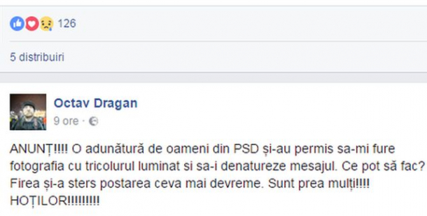 "ANUNȚ!!!! O adunătură de oameni din PSD și-au permis sa-mi fure fotografia cu tricolurul luminat si sa-i denatureze mesajul. Ce pot să fac? Firea și-a sters postarea ceva mai devreme. Sunt prea mulți!!!! HOȚILOR!!!!!!!!!", a scris fotograful pe pagina sa de Facebook.