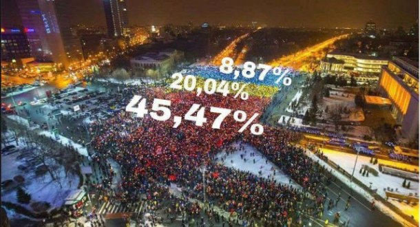 Imaginea fotografului Octavian Drăgan realizată duminică seara cu tricolorul uriaș format de cei peste 50.000 de oameni de la protestul din Piața Victoriei a fost preluată de mai mulți internauți și redistribuită cu procentele obținute de partide la alegerile parlamentare din luna decembrie.