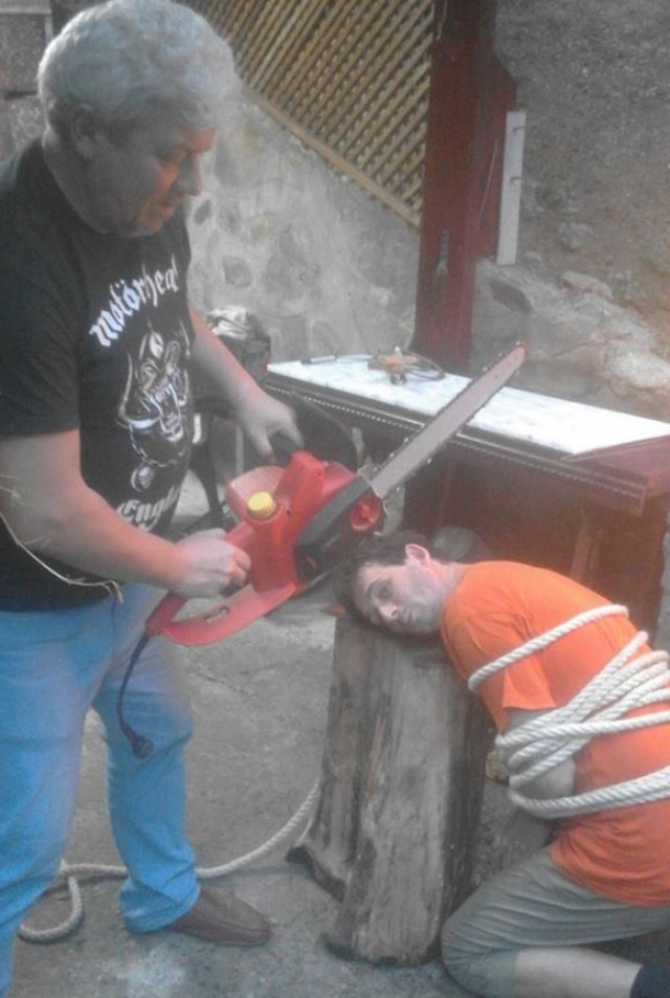Bărbatul ţine în mână o drujbă care este îndreptată spre gâtul unei persoane aflată în genunchi, cu mâinile legate pe lângă corp cu o funie şi cu capul aşezat pe un buştean.