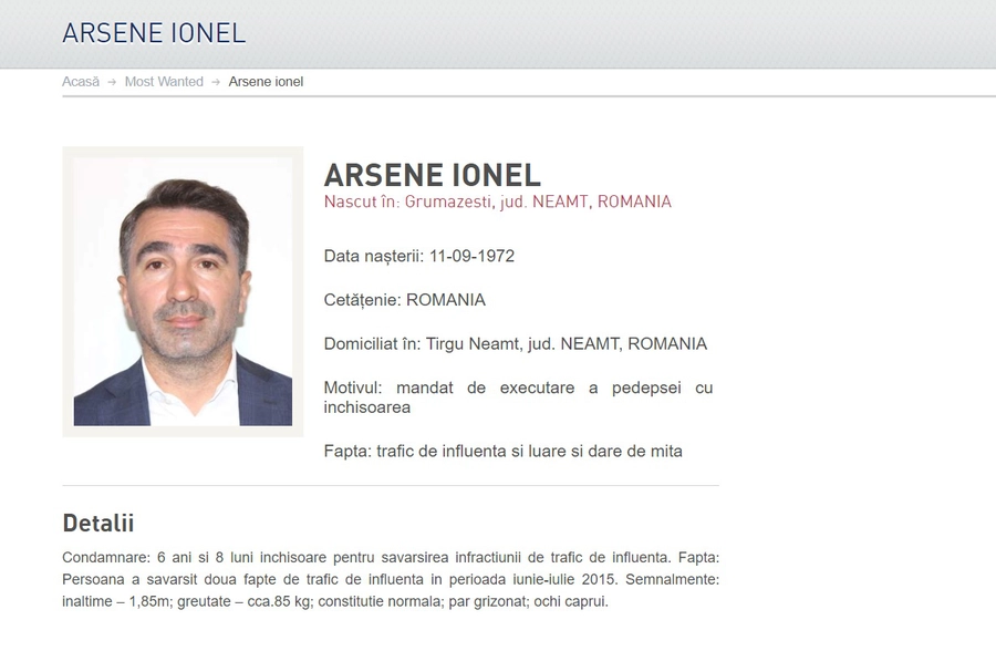 Ionel Arsene, baronul PSD de Neamț, condamnat vineri la 6 ani și 8 luni cu executare de Curtea de Apel Brașov într-un dosar de corupție, a fost dat în urmărire generală.