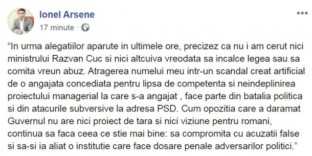 “În urma alegațiilor apărute în ultimele ore, precizez că nu i am cerut nici ministrului Răzvan Cuc și nici altcuiva vreodată să încalce legea sau să comita vreun abuz. Atragerea numelui meu într-un scandal creat artificial de o angajată concediată pentru lipsa de competență și neîndeplinirea proiectului managerial la care s-a angajat , face parte din bătalia politică și din atacurile subversive la adresa PSD. Cum opoziția care a dărâmat Guvernul nu are nici proiect de țară și nici viziune pentru români, continuă să facă ceea ce știe mai bine: să compromită cu acuzații false și să-și ia aliat o instituție care face dosare penale adversarilor politici”, a scris Ionel Arsene pe Facebook.