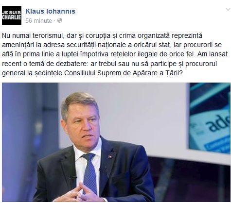 În urma atacului din capitala Franței, asupra publicației satirice Charlie Hebdo, Klaus Iohannis a postat un nou mesaj pe pagina sa de Facebook. Potrivit președintelui, procurorii se află ”în prima linie a luptei” împotriva terorismului.