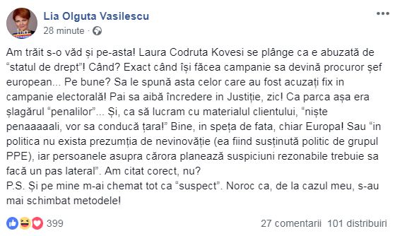 Olguţa o ironizează pe Kovesi, punând virgulă între subiect și predicat: ”Ca să lucram cu materialul clientului, ‘niște penaaaaali, vor sa conducă țara!’ Bine, in speța de fata, chiar Europa!” (FOTO)
