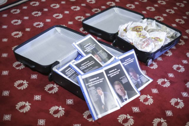 Drept reacție la dezvăluirile anunțate de RISE Project, Liviu Dragnea a venit în Parlament cu două valize: una plină cu gogoși, iar cealaltă cu mai multe dosare cu pagini despre Forumul Democrat al Germanilor din România și președintele Klaus Iohannis.