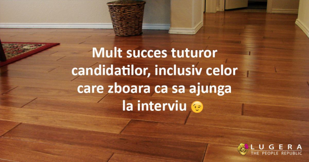 ”Mult succes tuturor candidaților, inclusiv celor care urmează să ajungă la interviu!”, a transmis compania de recrutare Lugera – Makler, atașând o imagine cu un…. parchet.